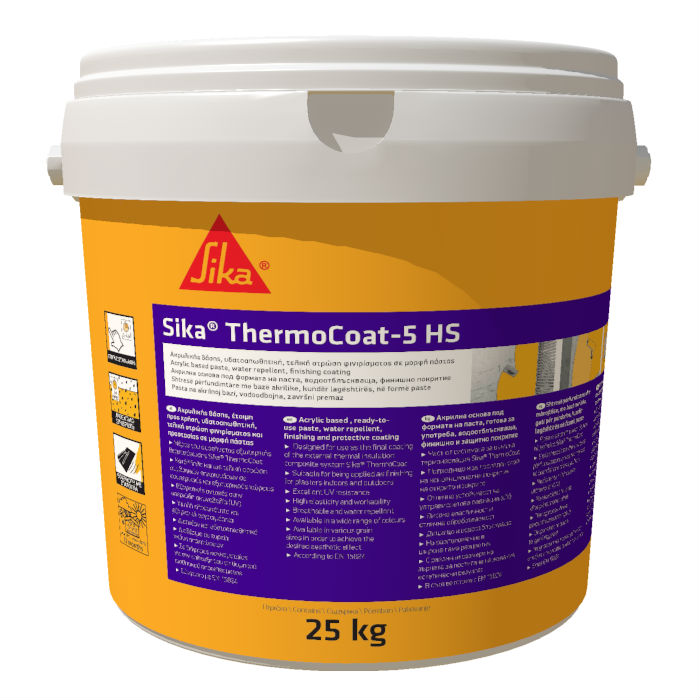 Το Sika® ThermoCoat-5 HS είναι ακρυλικής βάσης, έτοιμη για χρήση, υδατοαπωθητική πάστα, για χρήση ως τελικό επίχρισμα και προστατευτική επίστρωση. Είναι διαθέσιμη σε διάφορους τύπους που ποικίλουν στην κοκκομετρία και προσδίδουν διαφορετικό αισθητικό αποτέλεσμα στην τελική επιφάνεια.