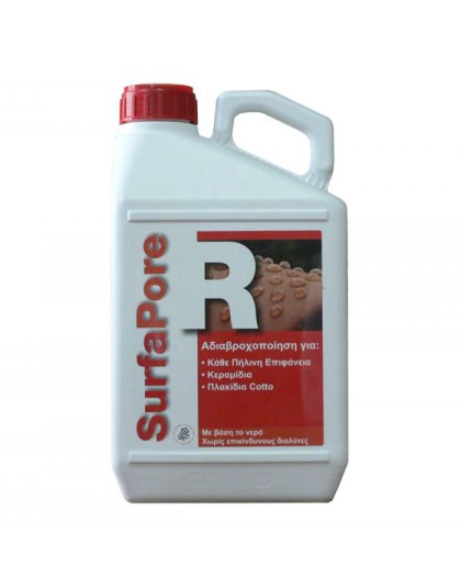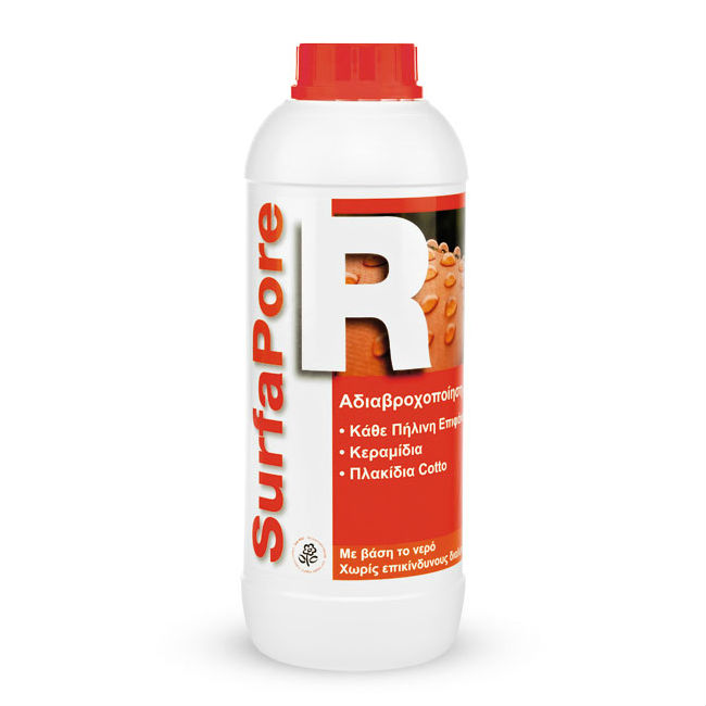 Τo SurfaPore R αδιαβροχοποιεί κάθε πήλινη και κεραμική επιφάνεια, προστατεύοντας από τους κύριους παράγοντες διάβρωσης, το νερό και το "πρασίνισμα" της μούχλας. Σχεδιάστηκε για να "εφαρμόζει" επιφανειακά διατηρώντας τη χρηστικότητα τους και την αισθητική τους τελειότητα. Οι επιφάνειες παραμένουν στεγνές ακόμα και όταν βρέχει.