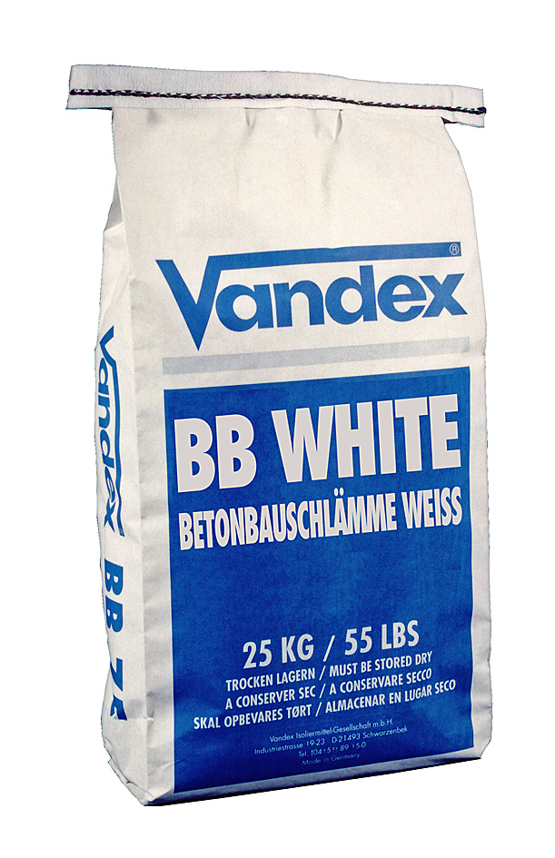 To Vandex BB White είναι τσιμεντοειδές επαλειπτικό στεγανωτικό επίχρισμα, λευκού χρώματος, κυρίως για επιφάνειες σκυροδέματος, με αντοχή σε αρνητική πίεση 7 bar. Είναι μίγμα λευκού τσιμέντου, χαλαζιακής άμμου με αυστηρά καθορισμένη κοκομμετρική διαβάθμιση και ειδικών ανόργανων χημικών ενώσεων. Μετά τη σκλήρυνση του, το επίχρισμα δεν παρουσιάζει κηλιδώσεις, είναι υδρόφοβο και απωθεί το νερό και την υγρασία. Το προϊόν είναι εγκεκριμένο για επαφή με πόσιμο νερό.