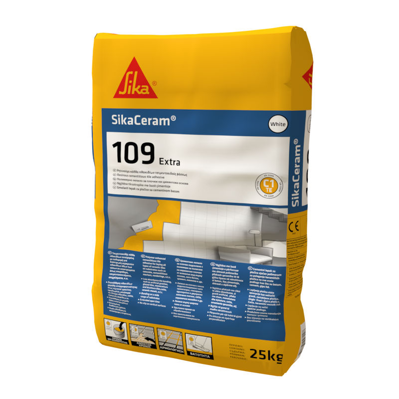 Η SikaCeram®-109 Extra είναι ενός συστατικού, τσιμεντοειδής λευκή κόλλα πλακιδίων, μειωμένης ολίσθησης, εκτεταμένου διαθέσιμου χρόνου με επιλεγμένα αδρανή, ειδικά πρόσμικτα και πολυμερή.