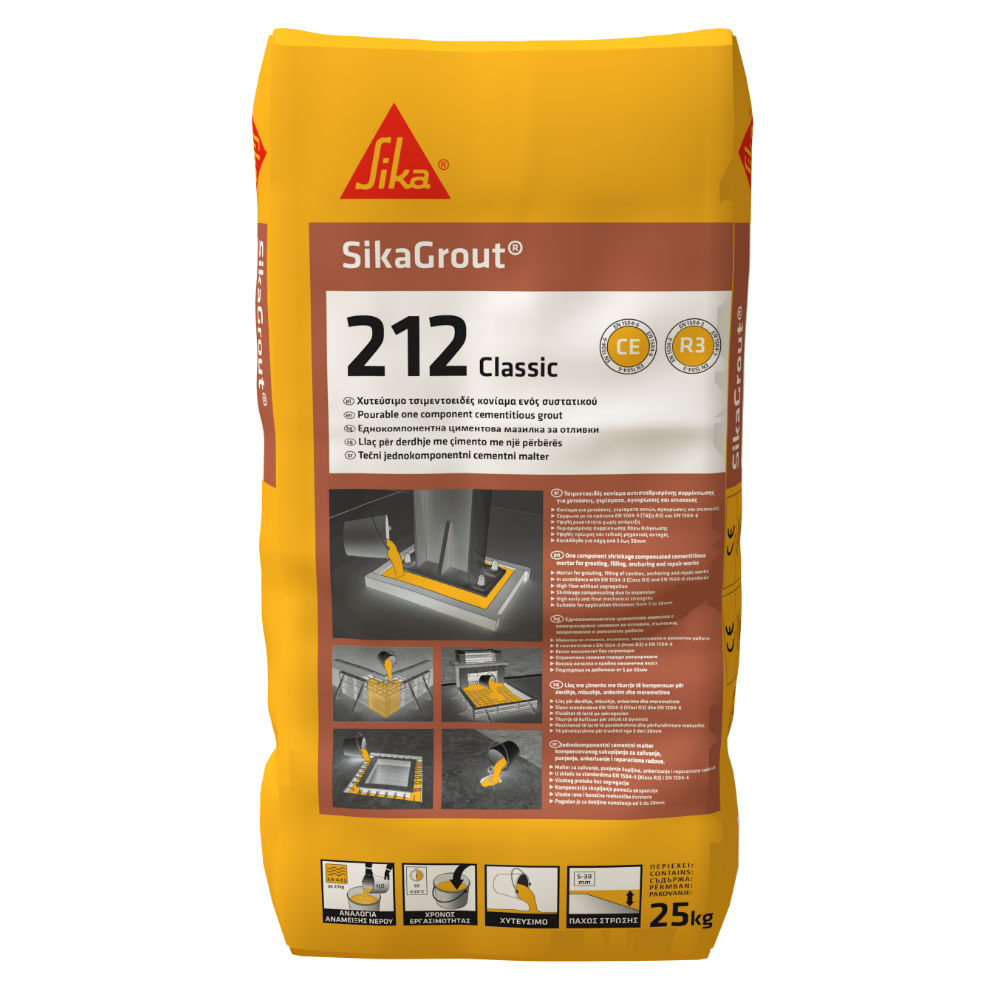 Το SikaGrout®-212 Classic είναι ενός συστατικού, έτοιμο προς ανάμειξη, έγχυτο, μη συρρικνούμενο τσιμεντοειδές κονίαμα ελεύθερης ροής, για πληρώσεις, αγκυρώσεις, χυτεύσεις και εργασίες επισκευών σύμφωνο με τις απαιτήσεις του ΕΝ 1504-6 και του ΕΝ 1504-3 (τάξεως R3).