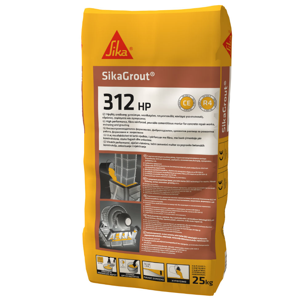 Το SikaGrout®-312 HP είναι ενός συστατικού, έγχυτο (τεχνολογίας SCC) τσιμεντοειδές, κονίαμα για πληρώσεις, αγκυρώσεις, χυτεύσεις και εδράσεις ακριβείας, επισκευές και αποκαταστάσεις / αύξησης της διατομής στοιχείων σκυροδέματος, σύμφωνο με τις απαιτήσεις των ΕΝ 1504-6 και ΕΝ 1504-3 (τάξεως R4).